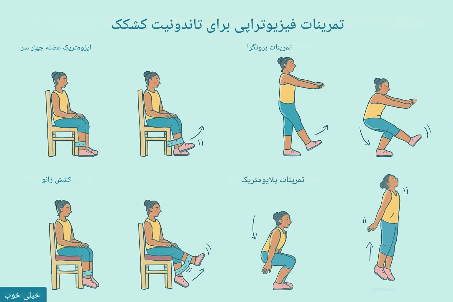 اگر درد زیر کشکک (تاندونیت کشکک) دارید ← تقویت عضله چهارسر ران با تمرینهایی مثل اسکوات نیمه و بالا بردن پا در حالت صاف میتواند فشار را از روی تاندون بردارد. در این مدت باید از پرشهای مکرر یا دویدن روی سطح سخت پرهیز شود.
