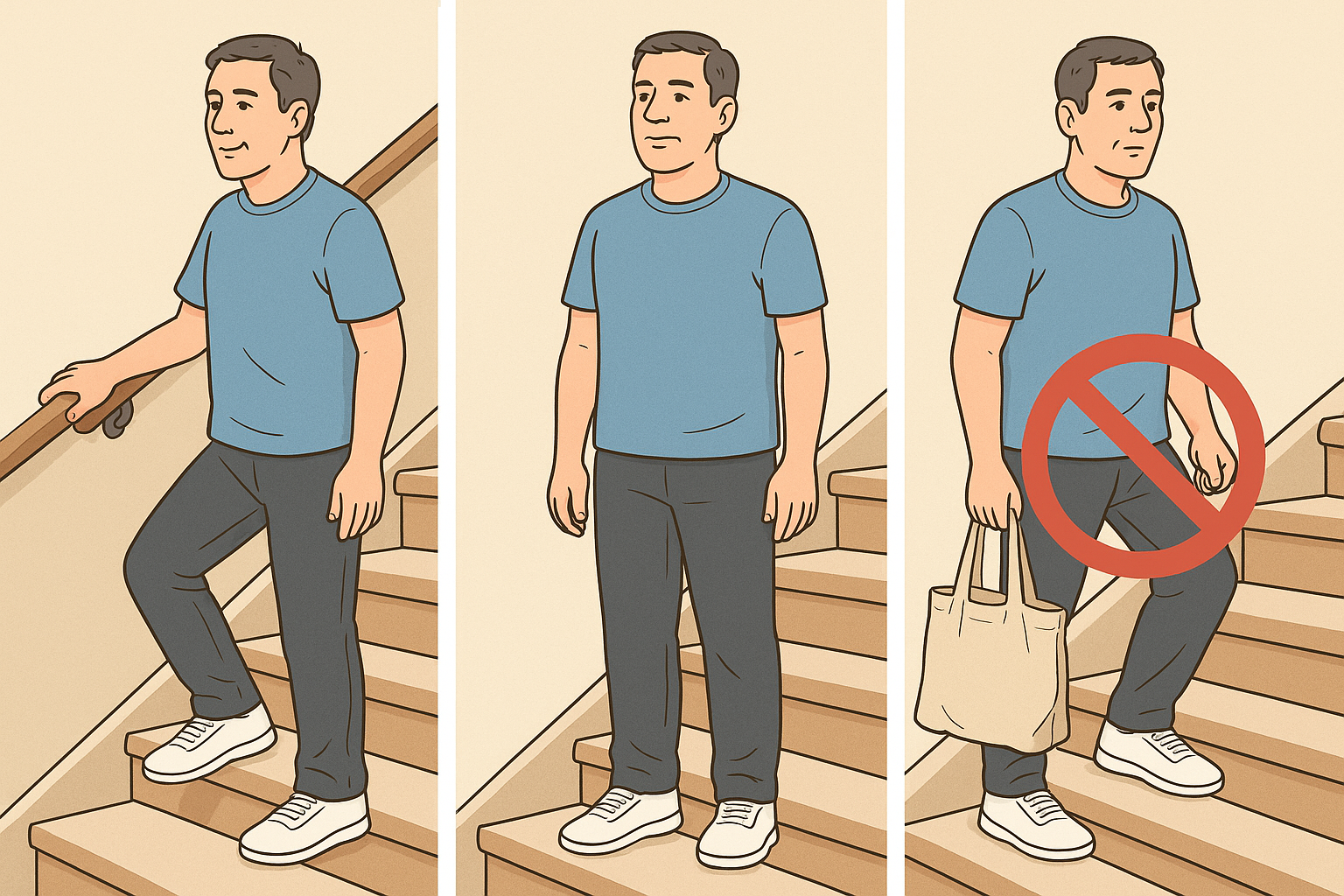 ۳. هیچ وسیلهای در دست نگیرید: تا چند هفته بعد از عمل، حتی خریدهای سبک یا کیف دستی را هم هنگام استفاده از پله حمل نکنید. هر بار که باری در دست دارید، تعادل بدن تغییر میکند و فشار بیشتری به ستون فقرات وارد میشود.