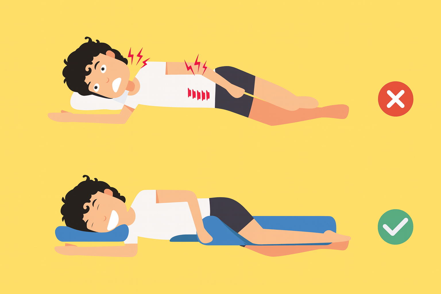 نحوه صحیح خوابیدن: بهترین حالت، خوابیدن به پشت با یک بالش زیر زانو یا خوابیدن به پهلو با قرار دادن بالش بین پاهاست. از خوابیدن روی شکم پرهیز کنید چراکه فشار زیادی روی مهرهها وارد میکند.